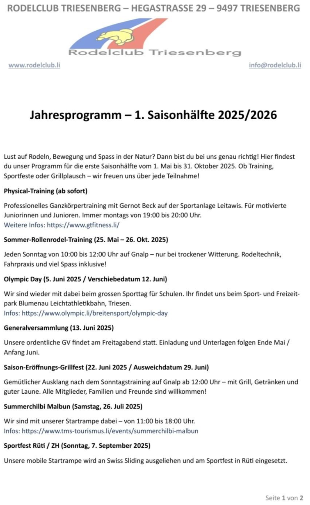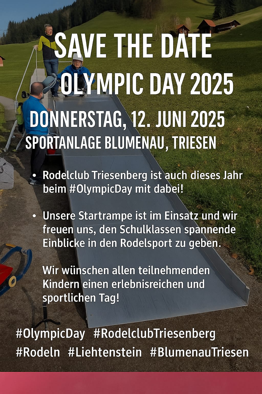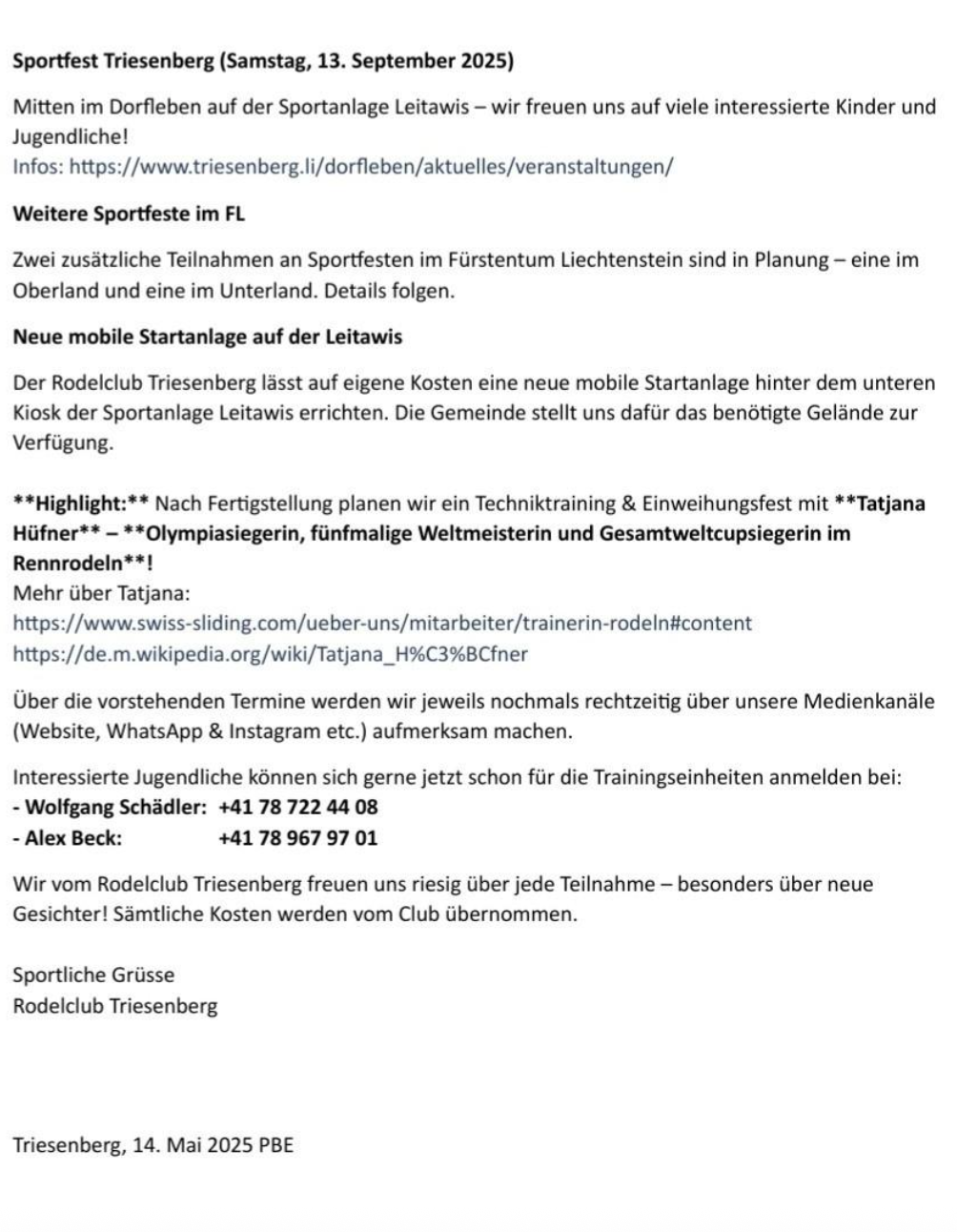 📍 Samstag, 13. September 2025 Sport- & Familientag Triesenberg | Sportanlage Leitawis 🕐 13:00 – 17:00 Uhr 🔥 Wettbewerb: Wer wird der schnellste Bärgr-Rodel-Starter? Zwei Kategorien: 👉 Erwachsene 👉 Jugendliche bis 16 Jahre 🏆 Pokale für Platz 1 bis 3 🎯 Zusätzlich Action auf der fixen Paddel-Startrampe!